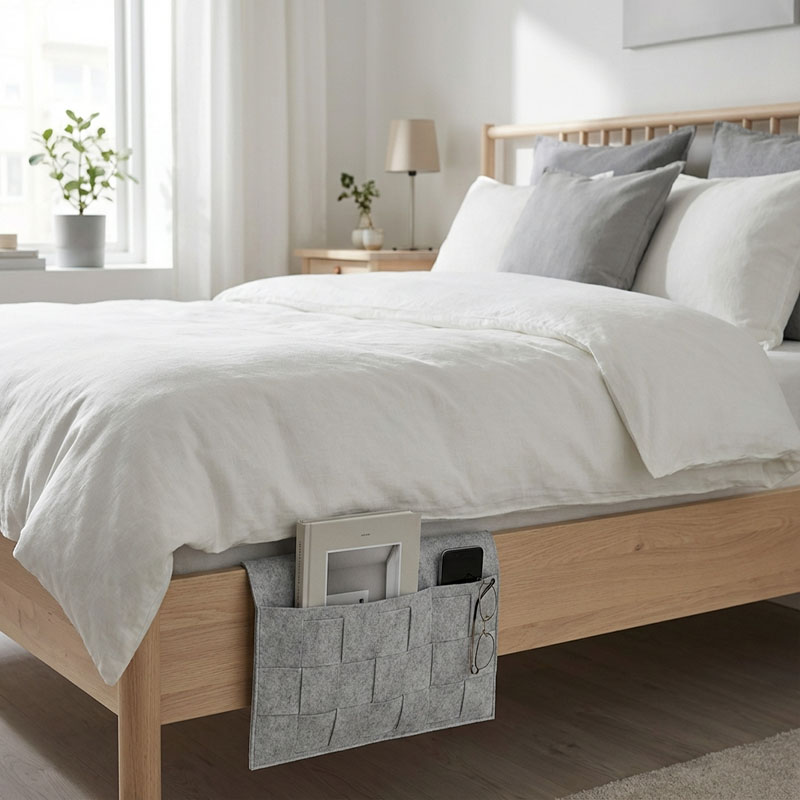 طراحی ساده و یکپارچهی آن باعث میشود بدون اشغال فضای اضافی، وسایل ضروری مانند کتاب، موبایل، کنترل، دفترچه، عینک یا شارژر همیشه در دسترس باشند. رنگ خنثی و بافت نرم نمدی، این ارگانایزر را به انتخابی ایدهآل برای دکوراسیونهای مدرن، مینیمال و اسکاندیناوی تبدیل کرده است.